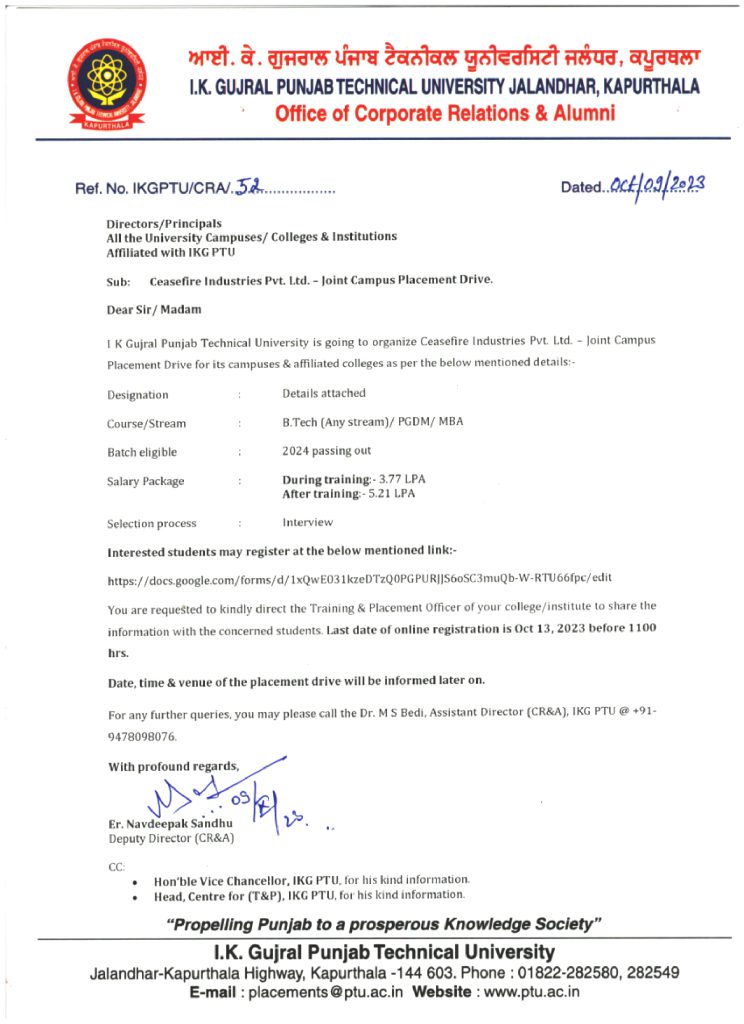 Ceasefire Industries Pvt. Ltd. – Joint Campus Placement Drive.
